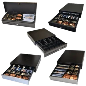 Kassenlade, Frontöffnung, Einsatz: 4 Scheinfächer, 8 Münzfächer, 2 Scheckfächer, 3 pos. Schloss, unterschiedliche Schließung, Anschluß an Kassendrucker, RJ12, Maße, B 410mm, H 103mm, T 420mm, Farbe: schwarz