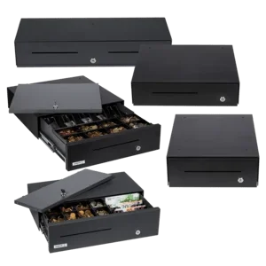 Kassenlade, Frontöffnung, Retail, 460x130x230mm, 4 Scheinfächer (vertikal), 8 Münzfächer, herausnehmbar, 1 Belegfach, 1 Scheckschlitz, Zylinderschloß, 3 pos. Schloss, gleiche Schließung, 24V, RJ11, separat bestellen: Schnittstellenkabel, Farbe: anthrazit