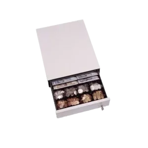 Kassenlade, Frontöffnung, 356x111x425mm, 6 Scheinfächer, 8 Münzfächer, 3 pos. Schloss, unterschiedliche Schließung, 75er Serie, Farbe: weiß