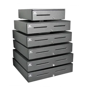 Kassenlade, Frontöffnung, Maße (BxHxT): 457x107x424mm, Einsatz: 5 Scheinfächer, 8 Münzfächer, herausnehmbar, 2 Scheckschlitze, kugelgelagerte Teleskopschienen, Unterbau geeignet, Zylinderschloß, 4 pos. Schloss, 12V, 24V, RJ11, schwarz